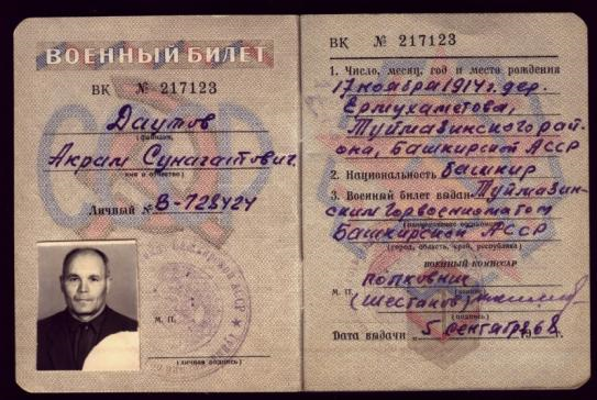 Акрам Сунагатович Даутов Акрам Даутов родился 17 ноября 1914 года в деревне Ермухаметово, в бедной крестьянской семье. Несмотря на бедность, родители Акрама – Сунагат Маннанович и Бибизакия Галимовна - старались дать сыну образование. К сожалению, отцу не суждено было долго жить, и в 1928 году он ушел из жизни. К этому моменту Акрам успел закончить 6 классов. 14-летним мальчишкой Акрам начинает самостоятельную жизнь. Учёба в Магнитогорском ФЗУР, учитель в уфимской начальной школе, секретарь кустовой ячейки комсомола и заведующий Чукады-Тамакской начальной школы; председатель рабочкома одного из хлопкосовхозов Средней Азии, курсант полковой школы 2-го стрелкового полка Казанской стрелковой дивизии Приволжского военного округа; первое офицерское звание - лейтенант, и направление в Киевский особый военный округ командиром взвода полковой школы 131-го Таращанского полка 40-й дивизии. Великую Отечественную войну старший лейтенант А. Даутов встречает в Одессе, в составе Южного фронта получает первое боевое крещение. Офицеру, командиру - преподавателю Акраму Даутову своим курсантам пришлось преподавать уроки военного искусства не в тактических классах, а непосредственно на поле брани. Ранения, госпиталь и снова на передовую командиром 1-го батальона 1151-го стрелкового полка 343-й стрелковой дивизии 56-й Армии. В апреле 1944 года, после излечения в эвакогоспитале города Мурома, майор Даутов получает назначение на I Белорусский фронт. Там принимает под свое начало учебный батальон, который готовил сержантский состав для действующей Армии. Командир учебного стрелкового батальона гвардии майор Акрам Даутов со своим переменным составом стремительно продвигается через Польшу в Германию, в направлении Берлина, к Победе. Апрель 1945 года - Дни штурма Берлина. Не сегодня - завтра конец многолетней кровопролитной войне. В этой благоприятствующей обстановке учебный батальон, которым командовал гвардии майор Даутов Акрам Сунагатович, был расформирован, и 29-летний старший офицер получает предписание в военную администрацию советских оккупационных войск в Германии. Далее в качестве заместителя военного коменданта по строевой части района Бад-Либенверды приступает к исполнению своих прямых должностных обязанностей. Провинция Саксония. Округ Мерзебург. Городок Бад-Либенверда лежит в руинах. Учреждения и предприятия не действуют. Личному составу военной комендатуры района Бад-Либенверды предстояло обеспечивать порядок и жизнедеятельность в обслуживаемом районе. Вся документация переписка проходили через руки Акрама Сунагатовича. Что-что, а штабной культуры у майора Даутова не занимать. Работы было много. В короткие часы отдыха Акрам Сунагатович берёт в руки своего верного спутника - аккордеон. Окруженный сослуживцами и простыми немецкими гражданами, он наигрывает башкирские, татарские и русские мелодии. Музыка вновь и вновь возвращает его мысленно к родным краям. Народные башкирские и татарские мелодии льются по Бад-Либенверде. Душа рвется домой, в родные края. Наконец-то, после долгой разлуки, осенью 1946 года семья А.Даутова благополучно добирается до Германии. Его любимая супруга Махбуба, дети Заира и Фиат теперь рядом с ним. Уже больше года как закончилась война. Жизнь в Германии начинает входить в колею, и Акрам Сунагатович начинает чувств